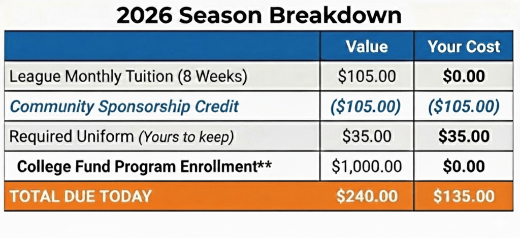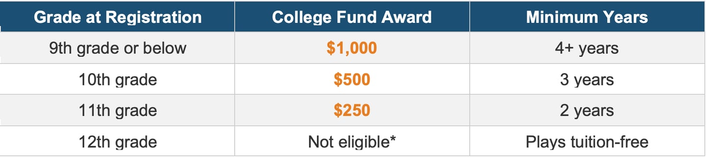 Because we reward commitment, every registered player who stays active through high school graduation earns up to a $1,000 College Fund Award.
